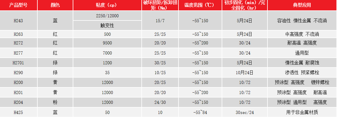 螺纹锁紧胶是最有效的螺纹锁固和密封方式之一,适用于从小型电子零件到重型机械设备的锁固和密封,也可应用于非金属紧固件和多用途紧固件的锁固和防松脱。