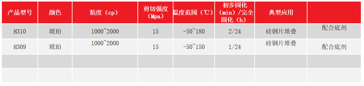 产品特点 ● 铁芯硅钢片堆叠采用胶粘方式,可以有效提高电机的能量密度 ● 厌氧胶方式尤其对间隙控制和装配效率有极大提升 性能参数 电机应用整体解决方案 公司产品广泛应用于各行业中的各类小微电机磁钢粘接。此外,我们还针对小微电机装配过程中的轴承固定、端盖密封、紧固件锁固与密封、PCB及编码器元器件固定,以及水冷/油冷系统管路密封等需求,提供全面的系统解决方案。...